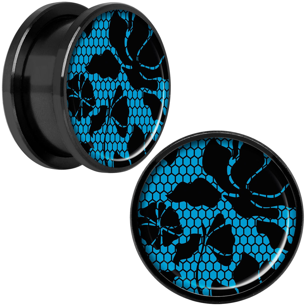 Blue Floral Lace Black Anodized Screw Fit Plug Set 18mm