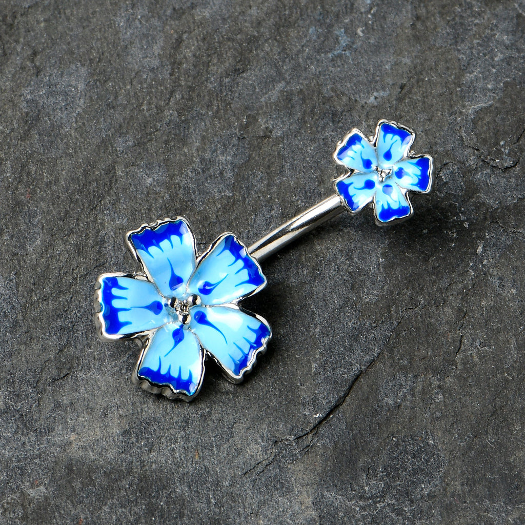 This 14 gauge navel ring has an extra treat at the center! It's made with a 3/8" durable 316L surgical grade stainless steel curved barbell. Each of the ends features a flower charm, inlaid in light blue with delicate dark blue detailing. They also feature textured embellishment at the center for an added touch of drama! You'll want to flaunt these flowers everywhere you go with this fabulous, fashionable, flower belly piercing ring!