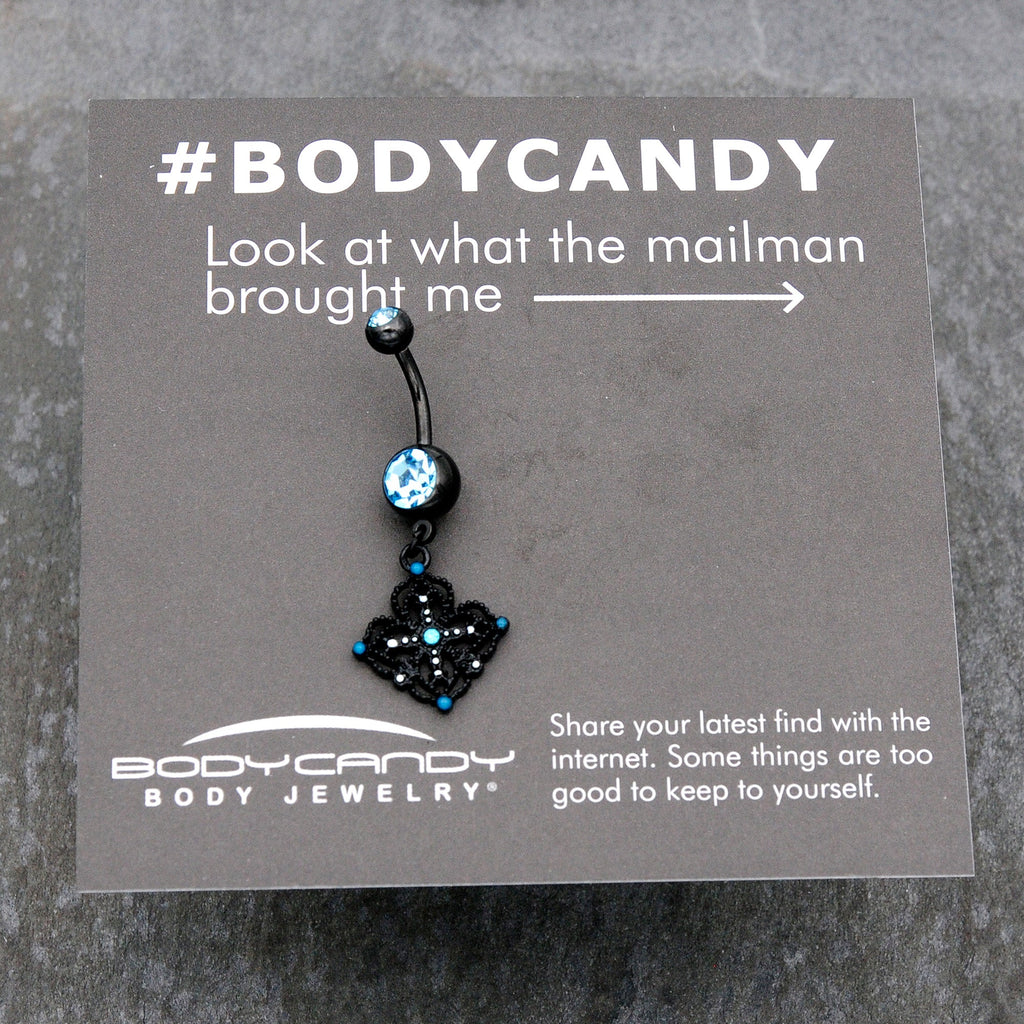 Let this 14 gauge navel ring get your look all laced up. It is made with a 3/8 inch black PVD over 316L surgical grade stainless steel curved barbell. It has a 5mm top ball end and 8mm bottom ball end, both of which are set with blue gems. Dangling beneath is a lacy styled black charm, set with a blue gem center. It is further embellished with blue and white along the edges and textured detailing. You are going to love the look of lace when you are rocking this airy, lace-inspired belly piercing ring.Specifications
