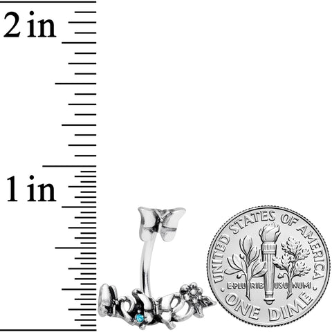 Hooray for the array of butterflies on this 14 gauge navel ring! It's made with a 3/8" durable 316L surgical grade stainless steel curved barbell. The top end features a single butterfly with simple detailing. The bottom end features a curving butterfly charm with a pair of butterflies and a single flower. It also features a single blue gem between the butterflies for an added touch of style. These butterflies are bound to beautify your belly button piercing!