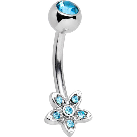 Wow, smell those freshly cut flowers! This beautiful 14 gauge dangle belly ring features a whole field of beautiful flowers! A trio of five petal flowers encrusted with blue gems is mounted on a 7/16" curved barbell made with durable 316L surgical grade stainless steel complete with a flower charm bottom accent and a top blue gem ball. Upgrade your belly button jewelry with this glamorous piercing today!