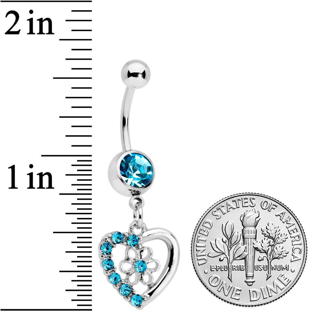 Keep your heart open and good things will bloom - like on this 14 gauge navel ring! It's made with a 3/8" durable 316L surgical grade stainless steel curved barbell with a 5mm top ball end. The bottom ball end is 8mm and set with a large blue gem. Dangling beneath it is a hollow heart charm, with one side of the heart set with matching blue gems. At the heart's center is a small openwork flower with a single blue gem at its center. For the incurable romantic, this floral valentine's belly piercing ring is sure to make you fall in love!