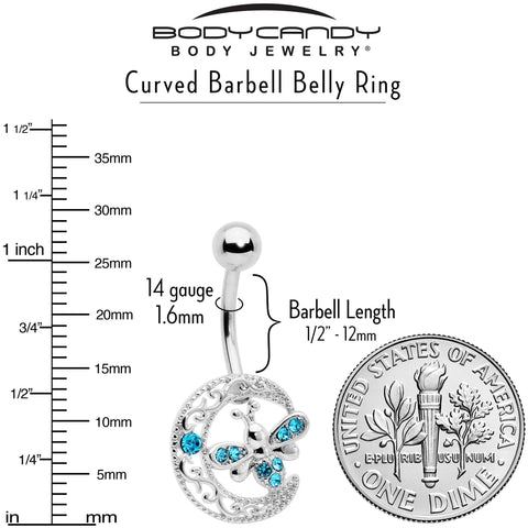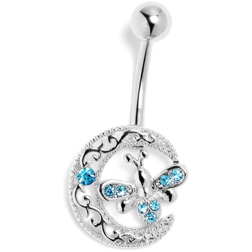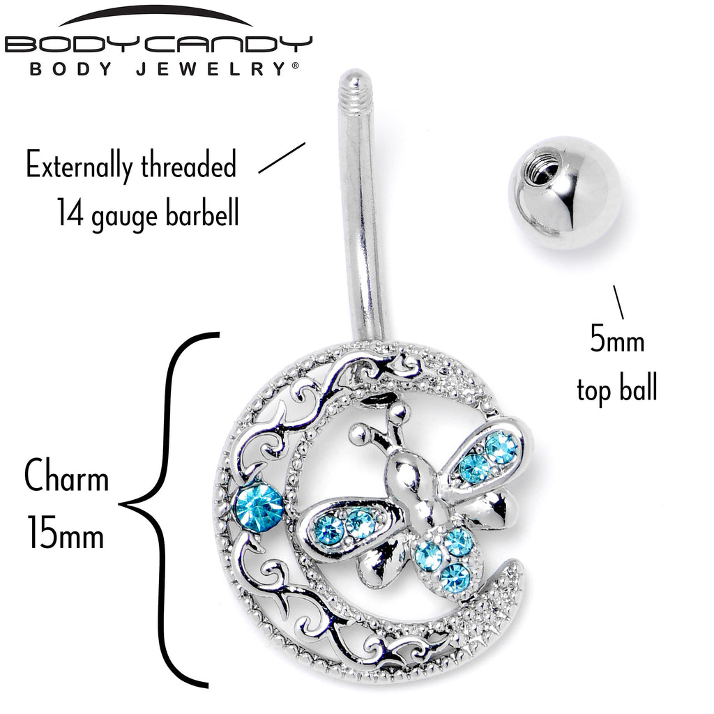 This crescent moon may be alone in the sky but it's got a friend on this 14 gauge navel ring. It is made with a 3/8 inch 316L surgical grade stainless steel curved barbell and has a 5mm top ball end. The bottom end features a crescent moon charm, embellished with filigree detailing giving it an airy appearance as well as a blue gem embellishment. Set between the points of the moon is a dragonfly charm, with blue gems in the wings and body. You'll want this belly piercing jewelry to keep you company forever.Specifications