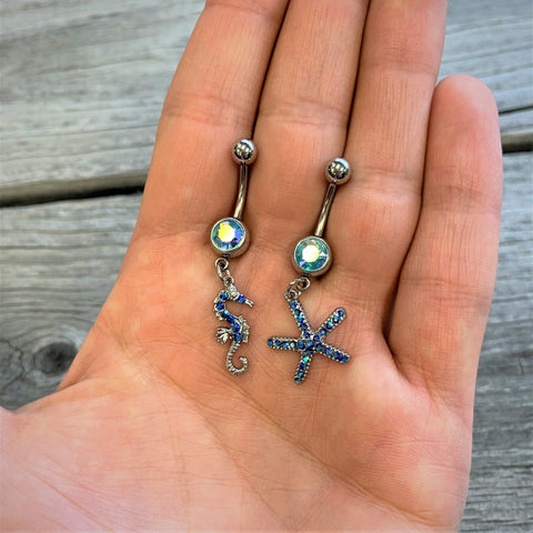Blue Gem Starfish Seahorse Nautical Dangle Belly Ring Set of 2