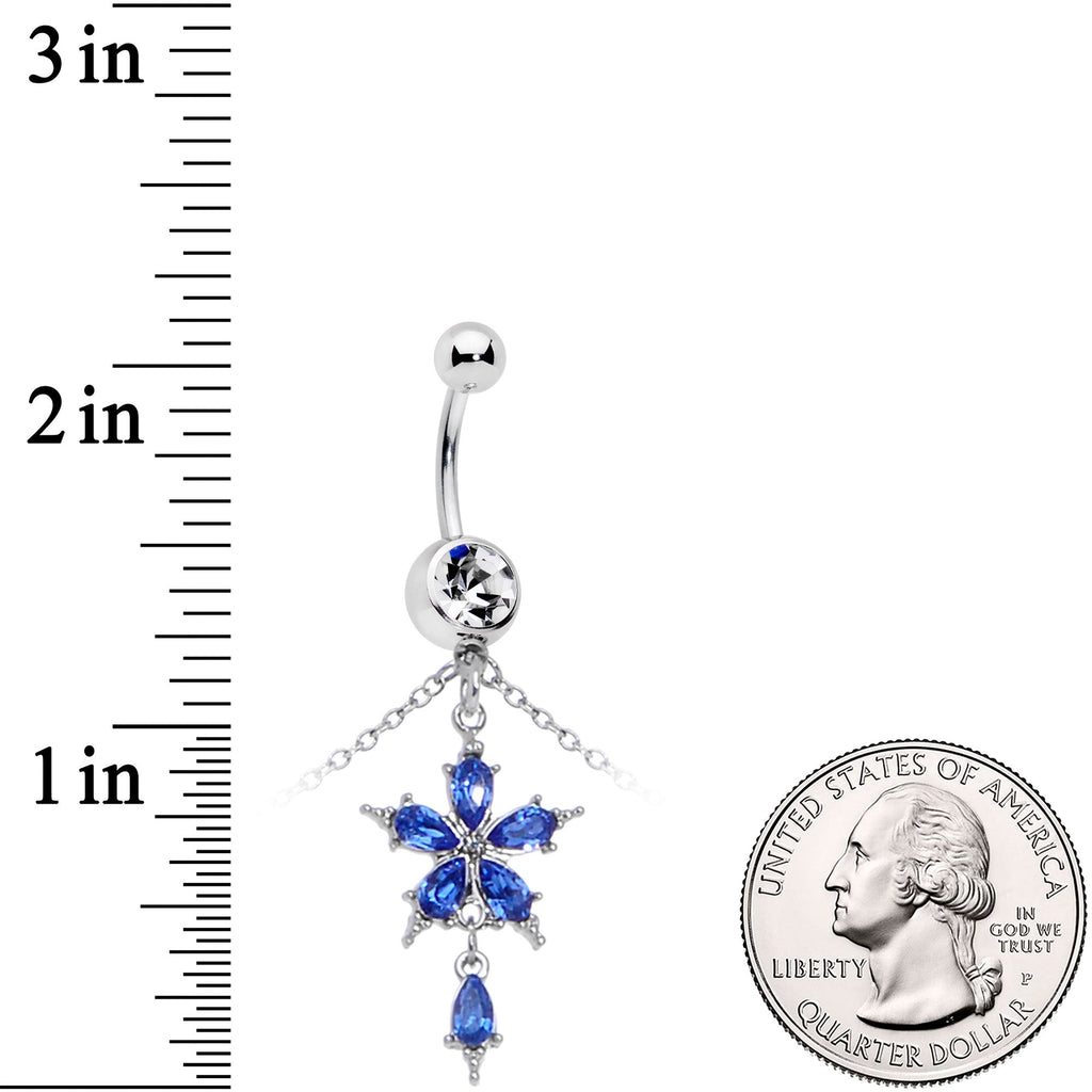 Don't let your midriff go bare when you wear your favorite halter top or belly shirt. This sexy belly chain jewelry is attached to a 14 gauge dangle belly button ring made with a 3/8" durable 316L surgical grade stainless steel curved barbell. This navel jewelry features a 34" chain length waist belt as well as a blue bottom gem with blue gem flower dangle charm. The waist chain features a lobster clasp used to adjust the length to fit your body.Specifications