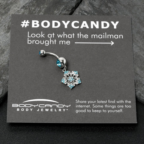 Double up on style with this 14 gauge navel ring. It is made with a 3/8 inch 316L surgical grade stainless steel curved barbell. The top ball end is 5mm while the bottom ball end is 8mm and both are set with blue gems. Dangling from the bottom is a flower charm, with openwork detailing and blue gems set at the ends of the petals. It is further embellished with a second flower at the center, composed of matching blue gems. Give your look twice the floral elegance with this double floral belly piercing ring.Specifications