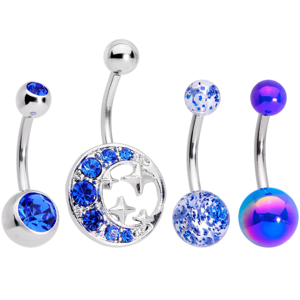 If you're looking for a pack of navel jewelry with a variety of fun looks then you will love this set of 14 gauge navel rings! Made with 3/8" durable 316L surgical grade stainless steel curved barbells, these belly button rings feature one belly button ring with blue gem top and bottom ball ends, one with blue confetti ball ends, one with pearlescent blue ball ends, and one with a crescent moon and stars bottom charm set with blue gems. Sold as a set of four.Specifications