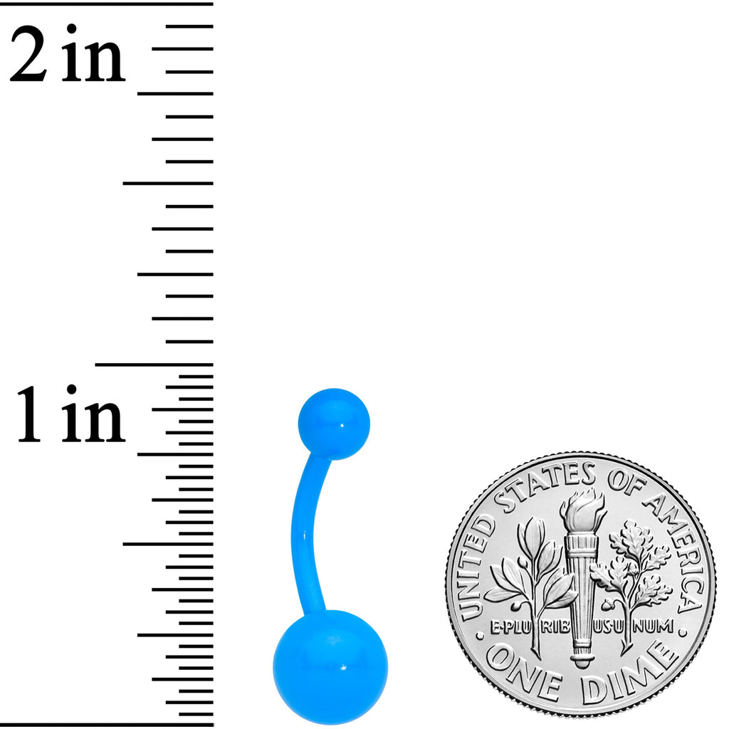 Shed a little light on the subject of body piercings when the lights go down....with this 14 gauge navel ring! It's made with a 3/8" blue glow in the dark plated over 316L surgical grade stainless steel curved barbell. It has a 5mm top ball end and an 8mm bottom ball end for an extra touch of asymmetrical style. And when the sun goes down, this belly button jewelry glows in the dark! Get yourself a glow-up in beautiful blue with this gorgeous glow in the dark belly piercing ring!Specifications