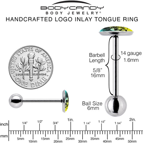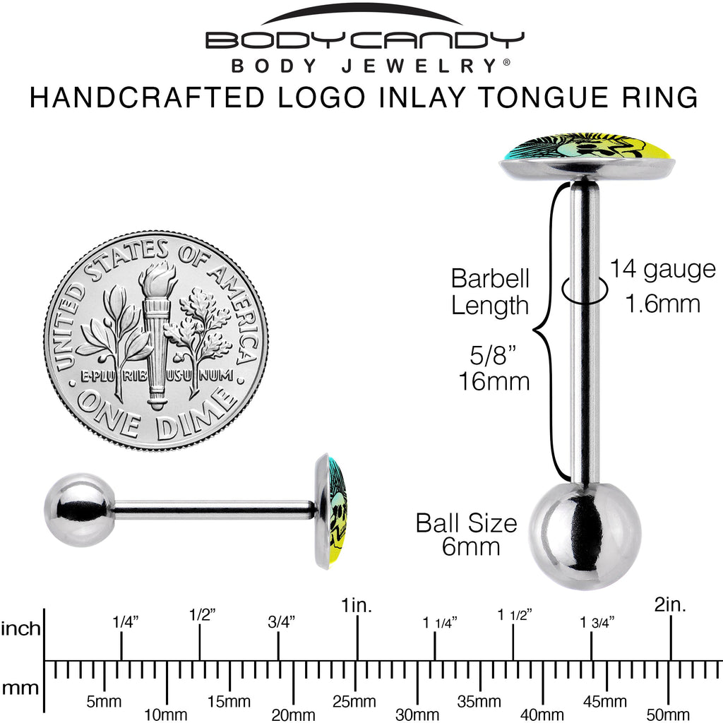 Add some palmy desert style to your look with a creepy twist when you're rocking this 14 gauge tongue barbell. It's made with a 5/8 inch 316L surgical grade stainless steel straight barbell with a 6mm bottom ball end. The top end features a logo disc charm of a silhouetted desert with a blue sky, yellow sand, and silhouetted palm fronds. At the center is a simple skull, adding a touch of eerie style to an otherwise peaceful scene. Let your look rest in peace with this sunset skull tongue piercing jewelry.