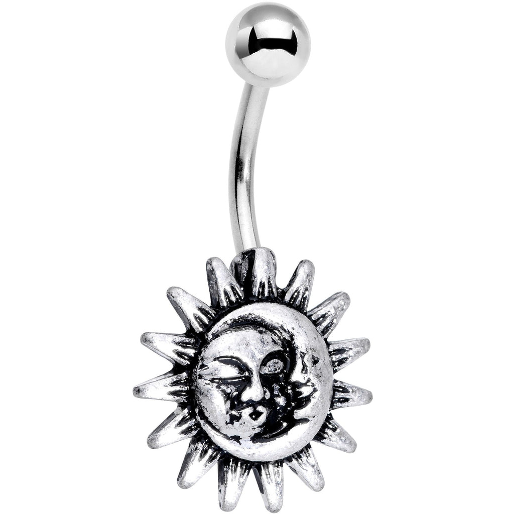 This pack of four belly button rings will make you feel hot and look cool! That's because it features an array of sun and moon themed charms. Included in this pack of 14 gauge belly button piercings are a sun and moon goddess belly ring, a blue gem sun belly ring, a ornate crescent moon belly ring, and a inverted triple crescent moon belly ring. Each navel ring is 3/8" in length and features a curved barbell made with durable 316L surgical grade stainless steel. This sunny and mystical treasure trove of navel jewelry will keep your soul in balance and make you look great too! Sold as a set of four.Specifications