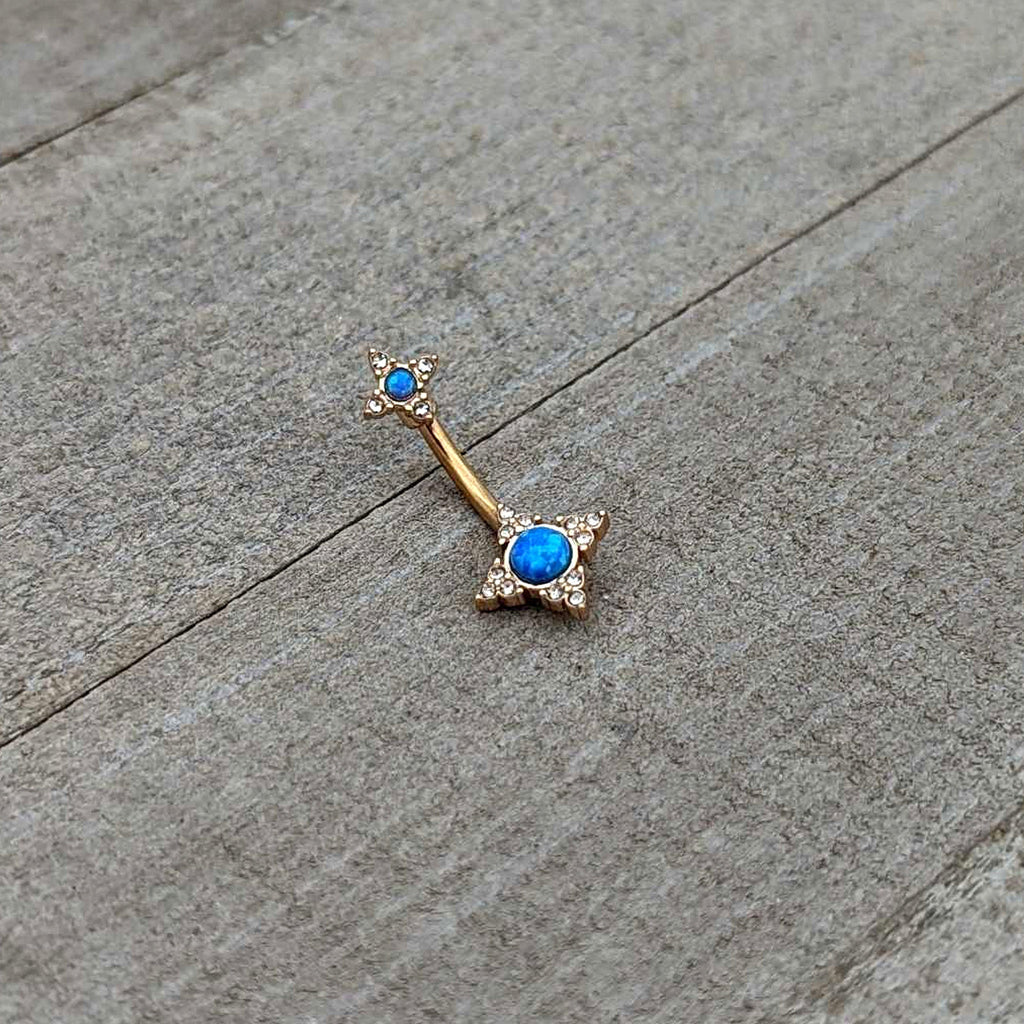 You'll feel like royalty when you're rocking this 14 gauge navel ring! It's made with a 3/8" gold tone PVD over 316L surgical grade stainless steel curved barbell. Each of the ends features an elegant rhombus charm, with clear gems set in each of the points. The rhombuses are set with blue synthetic opals at the center for a color contrast you can't take your eyes off of! Look as regal as you feel with this elegant rhombus belly piercing ring.Specifications