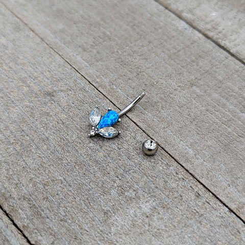 With lovely color and style, you can't help but love this 14 gauge navel ring! It's made with a 3/8" durable 316L surgical grade stainless steel curved barbell with a 5mm top ball end, which is set with a clear gem. The bottom end features a flower charm, the leaves set with small clear gems and the blossom composed of a blue synthetic opal. Keep it simple while keeping it stylish with this fabulous flower belly piercing jewelry!
