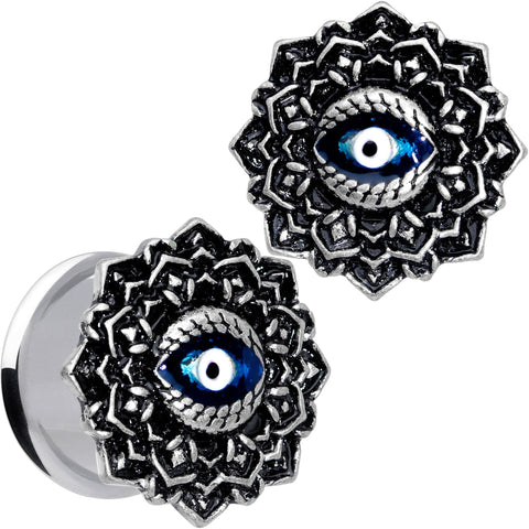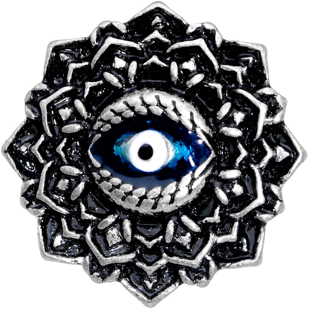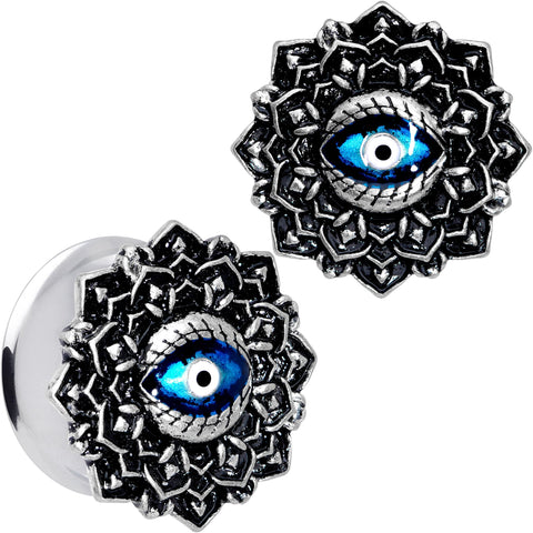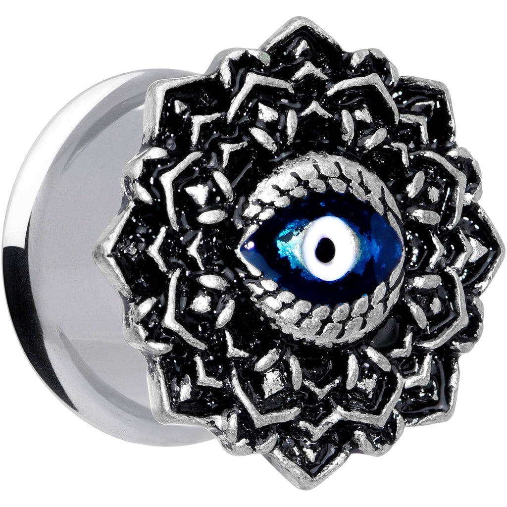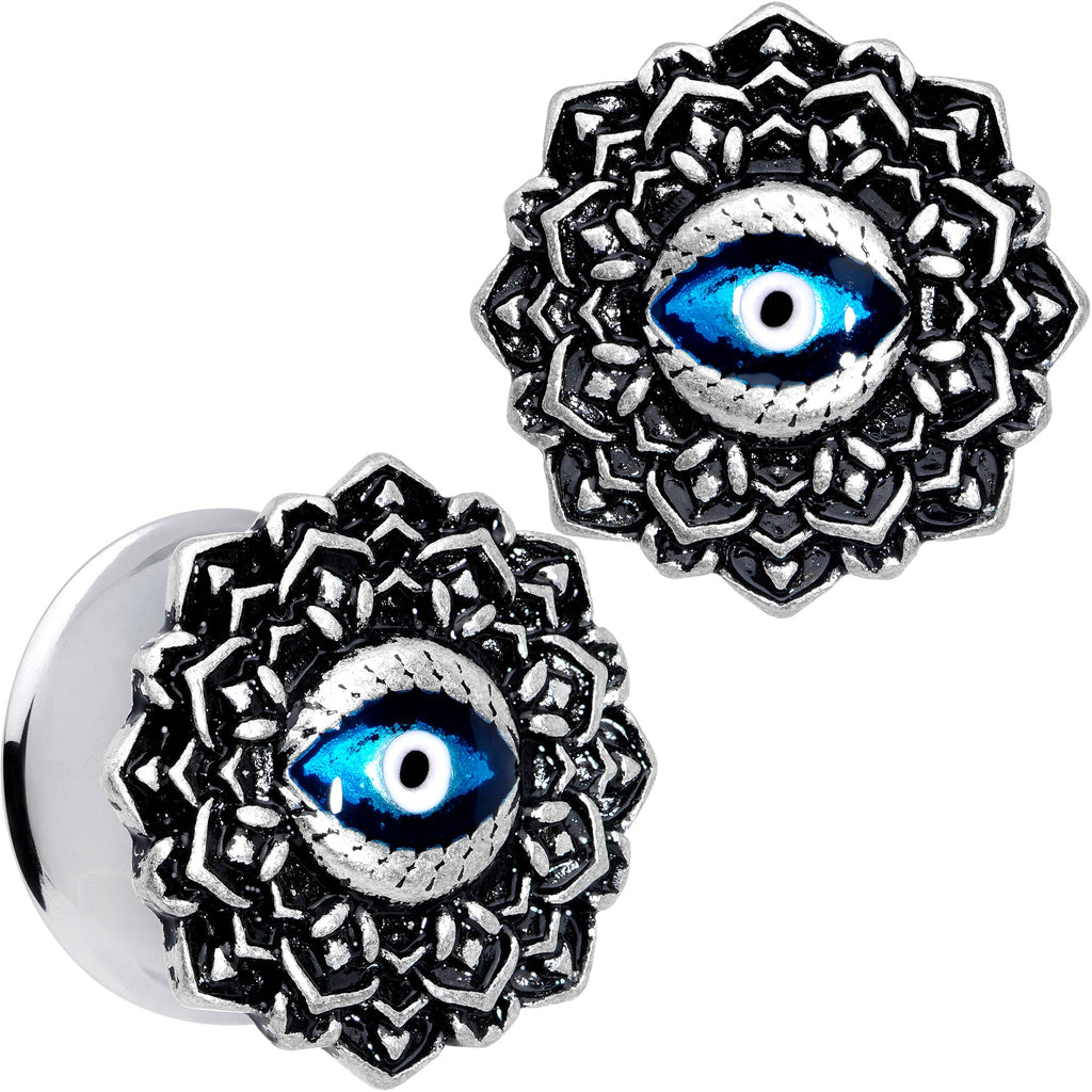 Keep an eye out for bad vibes with these spiritual and stylish double flare plugs! These ear gauges are made with durable 316L surgical grade stainless steel and feature a double flare design for a secure fit. The front features a traditional "evil eye" charm, in intense blue, with semi-realistic pupil and iris. The eye is surrounded by silver-tone detailing with burnished embellishment and set on a large ornate mandala design. These plugs have so much beautiful detail going on, you won't be able to take your eyes off of them! Sold as a set of two.Specifications