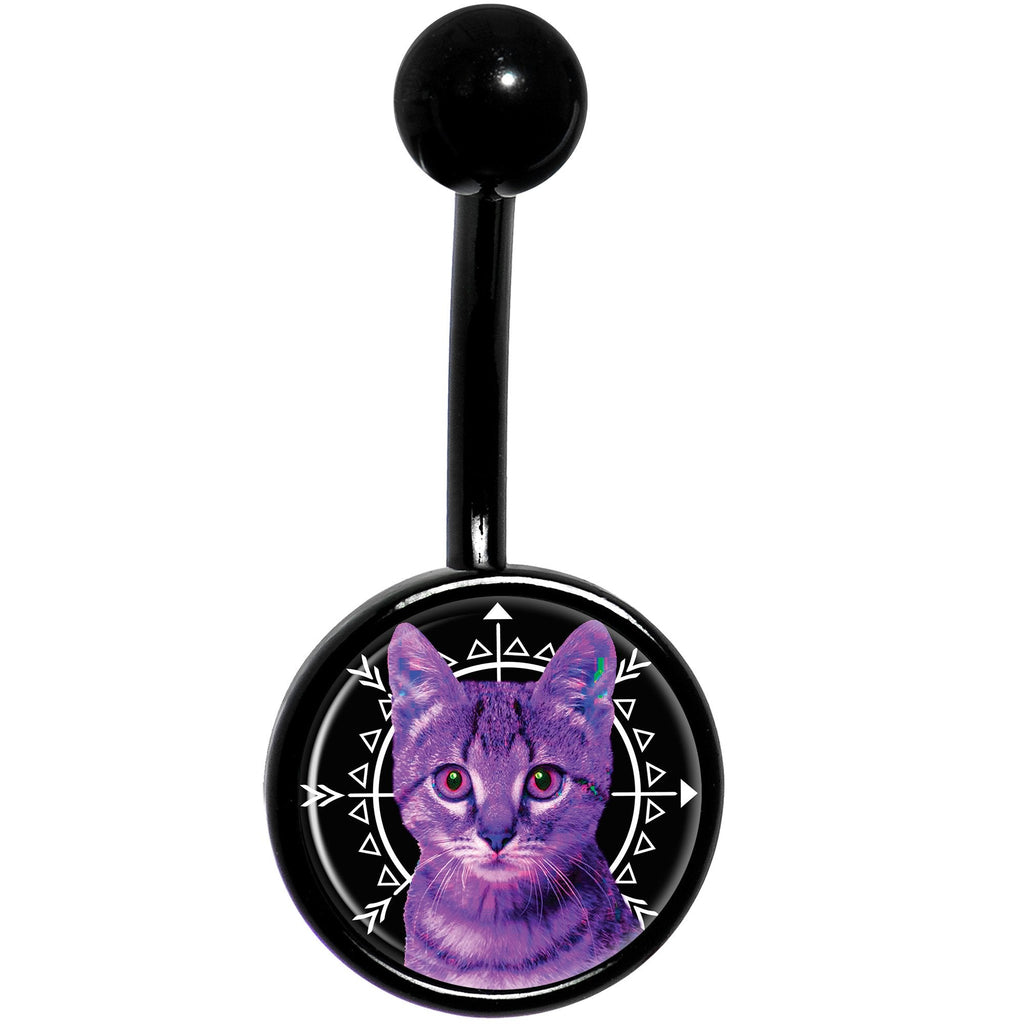If you're on your way to being a cat lady and lover stylish kitty cats then this navel jewelry is right for you! Made with a 7/16" black anodized over 316L surgical grade stainless steel curved barbell, this belly button ring features a fuchsia kitty cat on a black and white boho background logo inlay.Specifications
