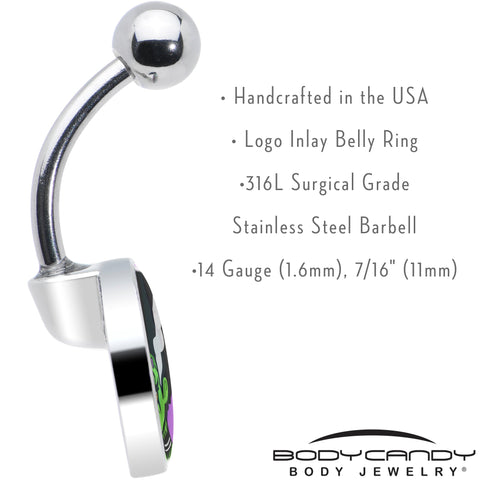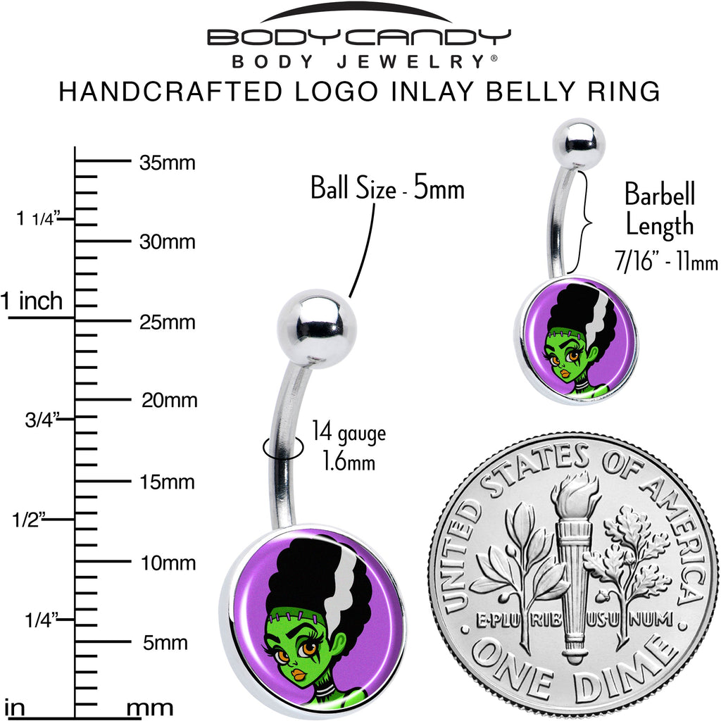 Behold, the most beautiful bride ever put together by a mad scientist is ready to grace your body with this 14 gauge stainless steel navel ring. It's made with a 7/16 inch 316L surgical grade stainless steel curved barbell with a 5mm top ball end. The bottom end features a purple disc logo charm with the original bridezilla, the Bride of Frankenstein, in glamorous style. Once you are rocking this stylish and spooky stainless steel belly piercing jewelry, you'll be ready to marry it. Unique artist-drawn logo inlay design surgical steel belly button ring.