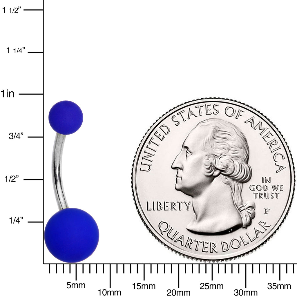 Some things need a softer touch....like this 14 gauge navel ring! It's made with a 3/8" durable 316L surgical grade stainless steel curved barbell. It has a 5mm top ball end and an 8mm bottom ball end. The ball ends feature a finish that's slightly soft to the touch, a perfect contrast to the beautiful, bright blue color! This vivid, eye-catching color is sure to stand out while its soft finish will ensure you will want to keep this belly jewelry in your navel piercing!