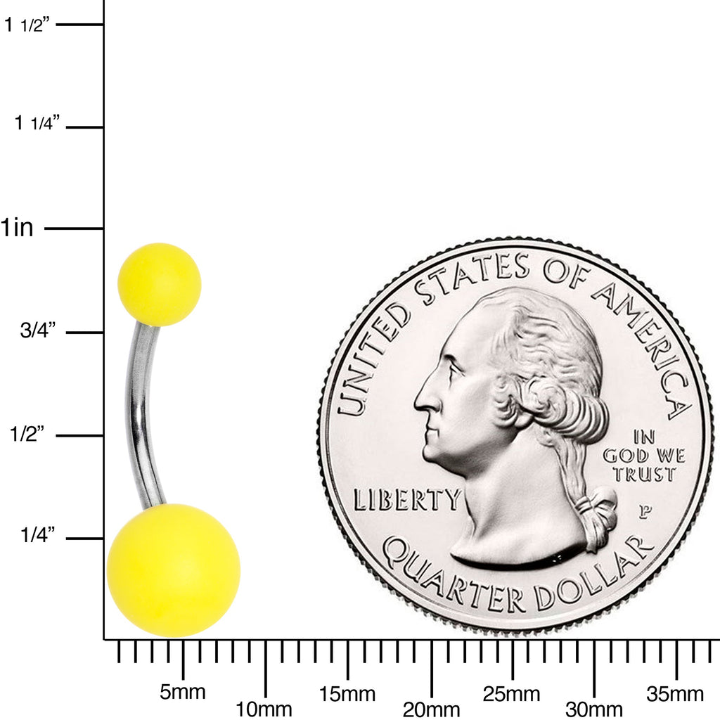 Some things need a softer touch....like this 14 gauge navel ring! It's made with a 3/8" durable 316L surgical grade stainless steel curved barbell. It has a 5mm top ball end and an 8mm bottom ball end. The ball ends feature a finish that's slightly soft to the touch, a perfect contrast to the lovely, powerfully yellow color! This vivid, eye-catching color is sure to stand out while its soft finish will ensure you will want to keep this belly jewelry in your navel piercing!Specifications