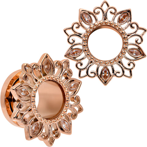 Brown Gem Rose Gold Tone Floral Edge Screw Fit Tunnel Plug Set