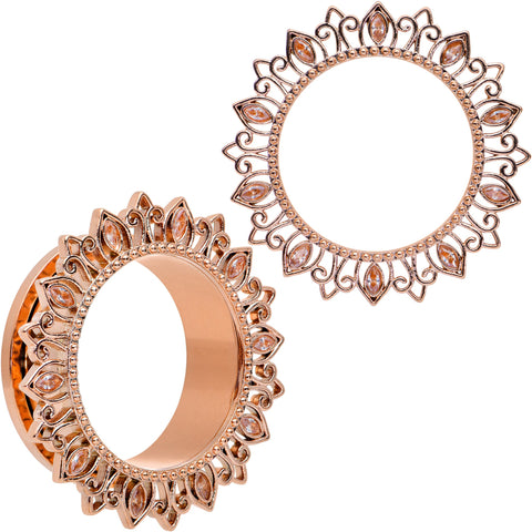Get a fantastically floral look without losing your edge with these tunnel plugs for your stretched lobes! They're made with rose gold tone anodized over 316L surgical grade stainless steel and feature a screw fit design that makes them easy to insert and remove. The front features an ornate, floral-inspired flare with fleur-de-lis embellishment all around the tunnel portion. The flare is further embellished with several smoky brown gems for a cohesive look that will knock your socks off! Add a little edge to your look with these fashionable, floral tunnel plugs! Sold as a set of two.Specifications