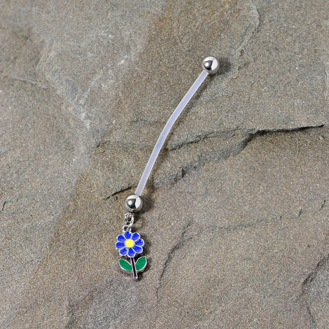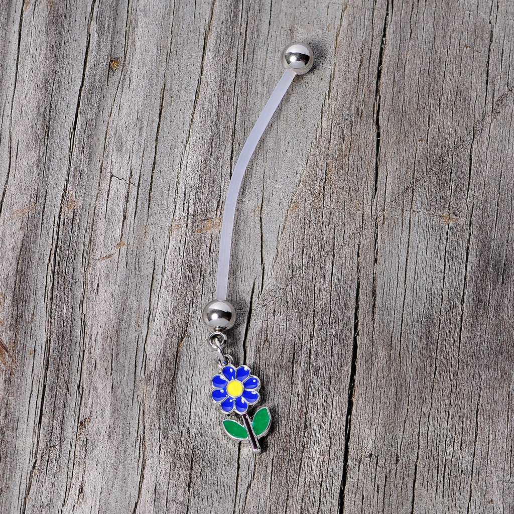 If you don't want to give up your navel piercing now that you're pregnant then you will love this 14 gauge belly button ring that is made for mommy's tummy. Made with a 1 1/2" clear Bioflex straight barbell, this navel jewelry features plain stainless steel ball ends and a green and blue flower charm that signifies the bun in your oven! The flexible Bioflex barbell is self-threading and can be trimmed to a perfect fit. Simply cut where needed and reattach the ball end for a fit that's custom to your changing body.Specifications