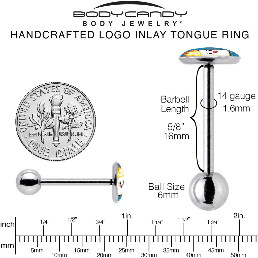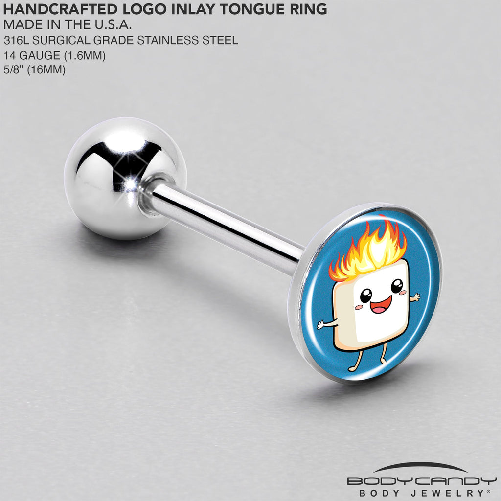 This whimsical 14 gauge stainless steel tongue jewelry is sure to make you melt. It's made with a 5/8 inch 316L surgical grade stainless steel straight barbell with a 6mm bottom ball end. The top end features a blue disc logo charm. Front and center is a happy, smiling marshmallow that doesn't seem to mind that it's on fire. For a sweet and unique look, this adorable stainless steel tongue piercing jewelry will fit the bill and s'more. Unique artist-drawn logo inlay design surgical steel tongue ring.