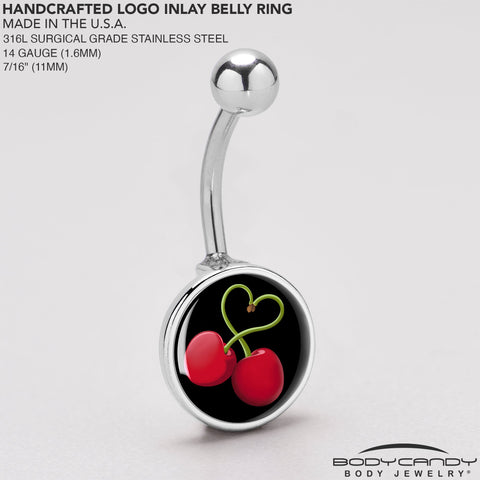 Nothing feels more amazing than finding the one that is right for you, like on this 14 gauge navel ring. It is made with a 7/16 inch 316L surgical grade stainless steel curved barbell with a 5mm top ball end. The bottom end features a black disc with a pair of cherries on it. The cherry stems are entwined to form a heart. Fall in love with a tasty new look with this charming cherry belly piercing jewelry.