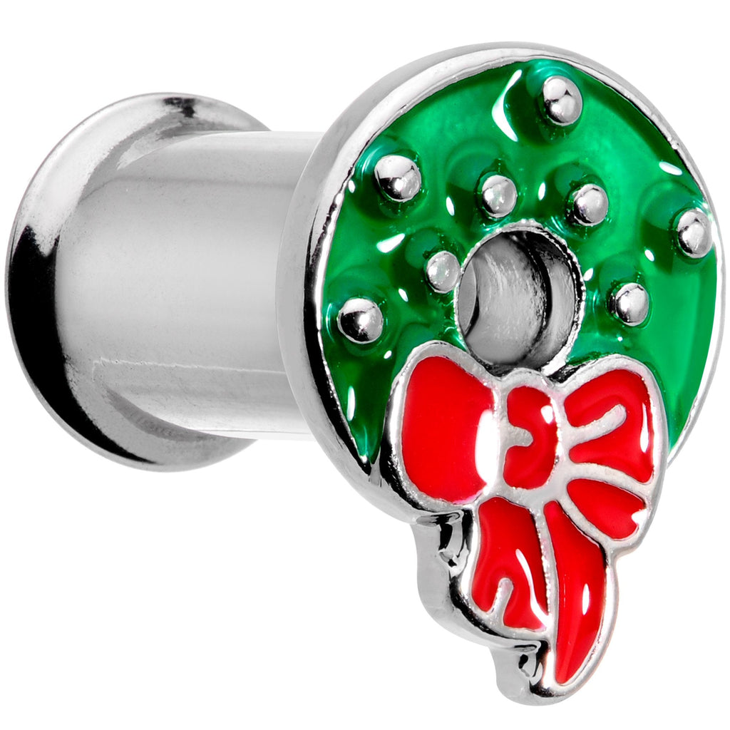 Lots of people hang wreaths from their doors and walls but how many wear them in their ears? These double flare plugs are with durable 316L surgical grade stainless steel for comfort and longevity. They feature festive wreaths, inlaid with rich evergreen and warm red for the bows. They are further embellished with silver tone details reminiscent of small holiday ornaments. Show your holiday spirit in a more creative way this year with these beautiful double flare tunnel plugs! Sold as a pair. NOTE: Prices of plugs may vary based on plug ear gauge size selected from drop down. Specifications
