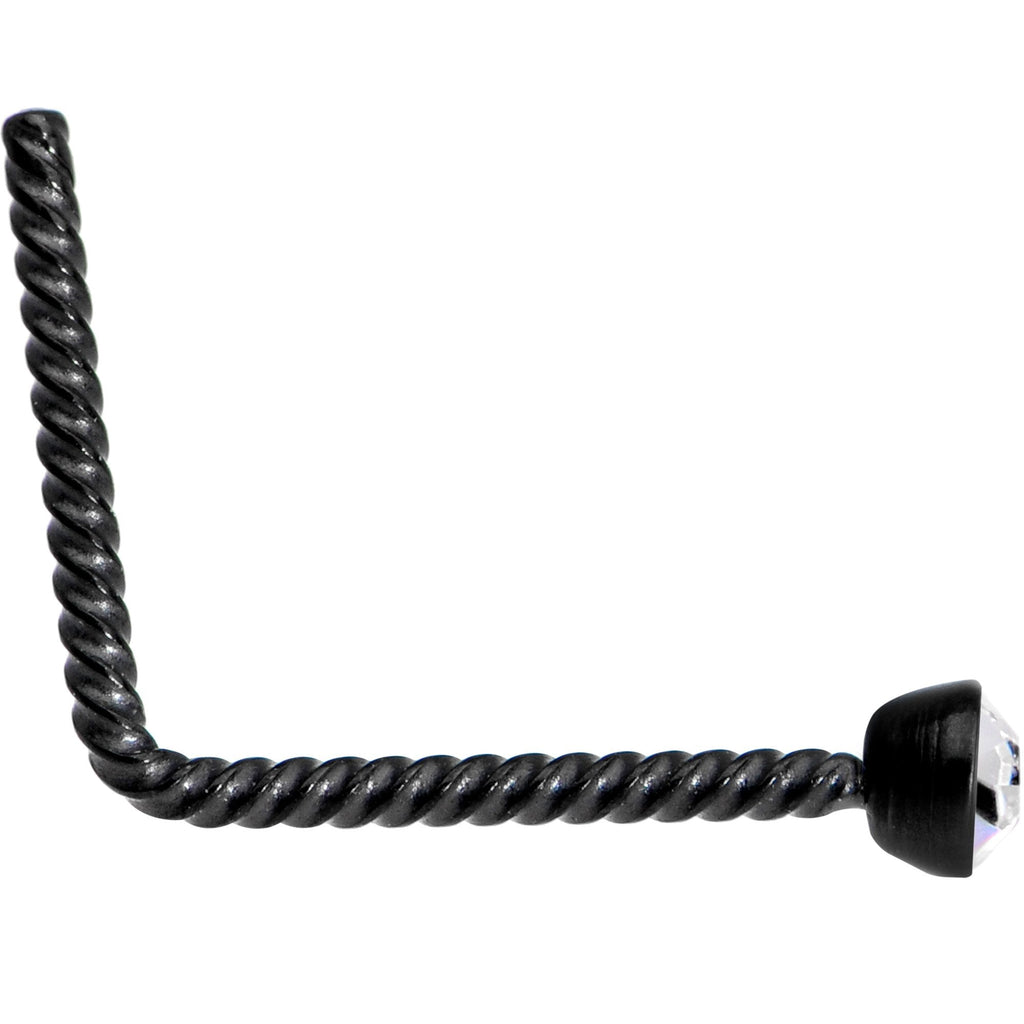 Looking for some simple nose jewelry with a twist? Look no further! This classic 20 gauge L-shaped nose ring features a twisted metal design and a sparkling 2mm clear gem end. The gem accent end is mounted on a 1/4" length at the bend L-shaped post made with black IP over 316L surgical grade stainless steel. Pick up this simple yet noticeable nose jewelry today!