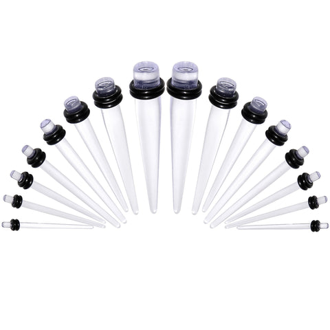 Hypoallergenic jewelry for sensitive skin.This clear acrylic plug and straight taper ear stretching kit includes 32 pieces. You will receive pairs of different size ear gauges in both tapers and straight plug styles ranging from 14 gauge up to 00 gauge. This acrylic ear stretcher kit features 1 pair each of 12 and 14 gauge tapers. The taper and plug sets included in this pack come in 10, 8, 6, 4, 2, 0 and 00 gauge sizes.