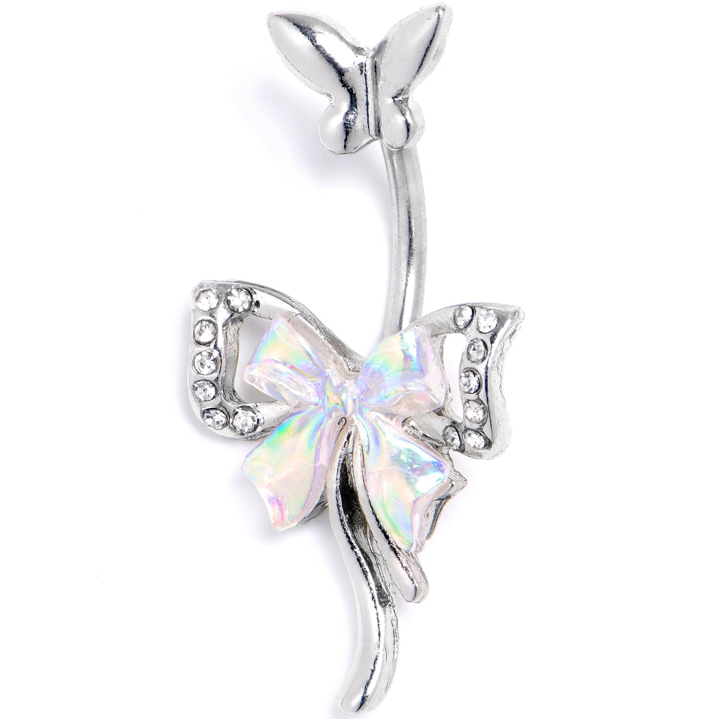Clear Aurora Gem Butterfly Ribbon Beauty Double Mount Belly Ring