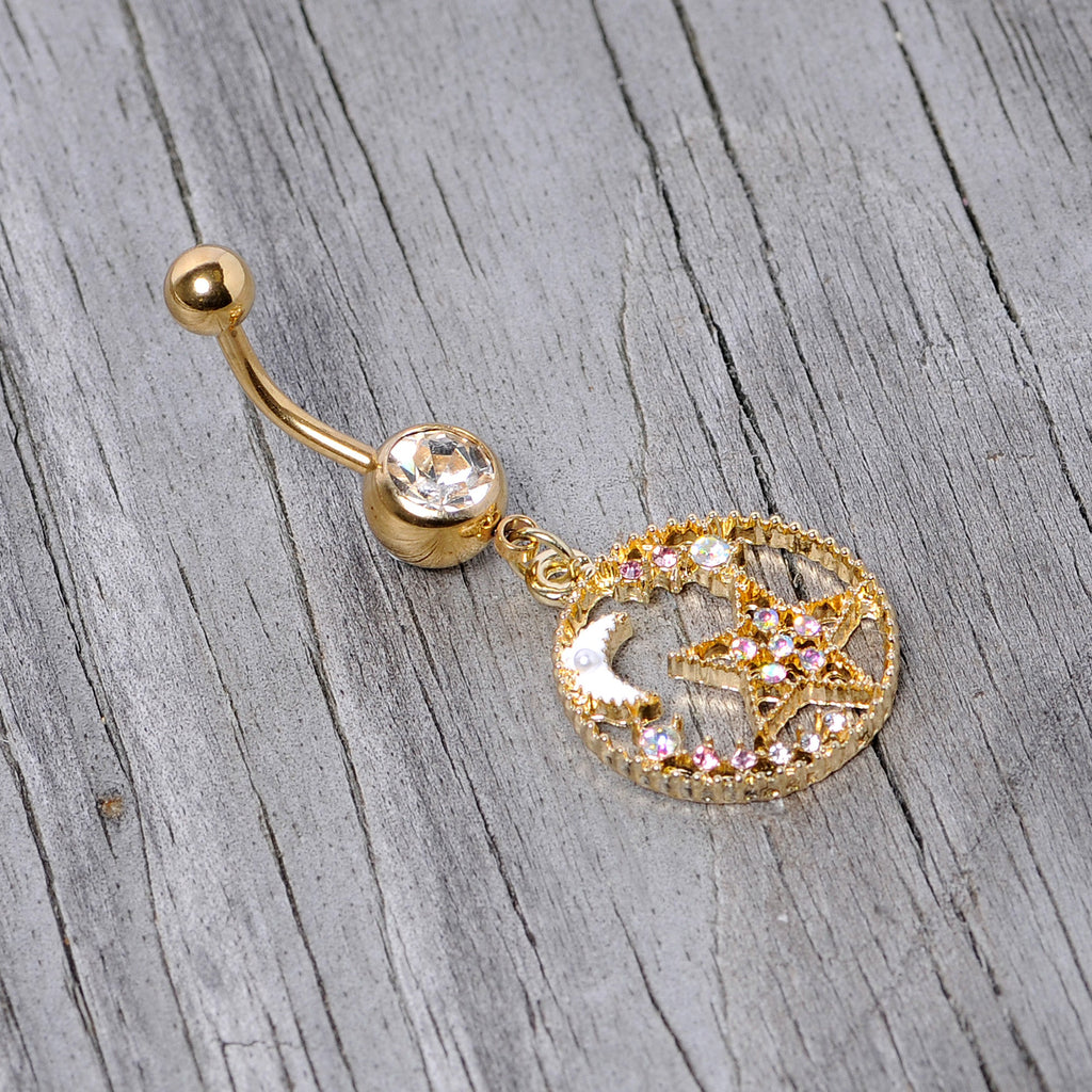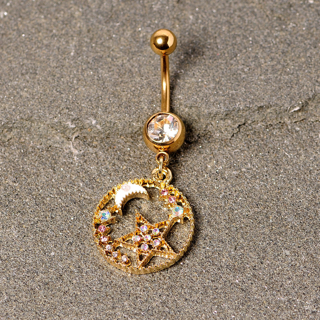Clear Aurora Gem Gold Tone Circle Star Moon Dangle Belly Ring