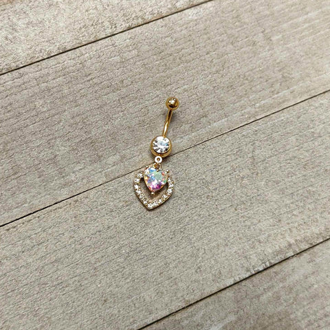 Look luxe and love it without breaking the bank with this 14 gauge navel ring! It's made with a 3/8" gold tone PVD over 316L surgical grade stainless steel curved barbell with a 5mm top ball end. The bottom ball end is 8mm and set with a large clear gem. Dangling beneath it is a heart charm, paved with clear gems and featuring an open center. At the topmost point is a heart-shaped aurora gem for added color and style. You're going to fall in love with the opulent look of this heart-themed belly button piercing ring!Specifications