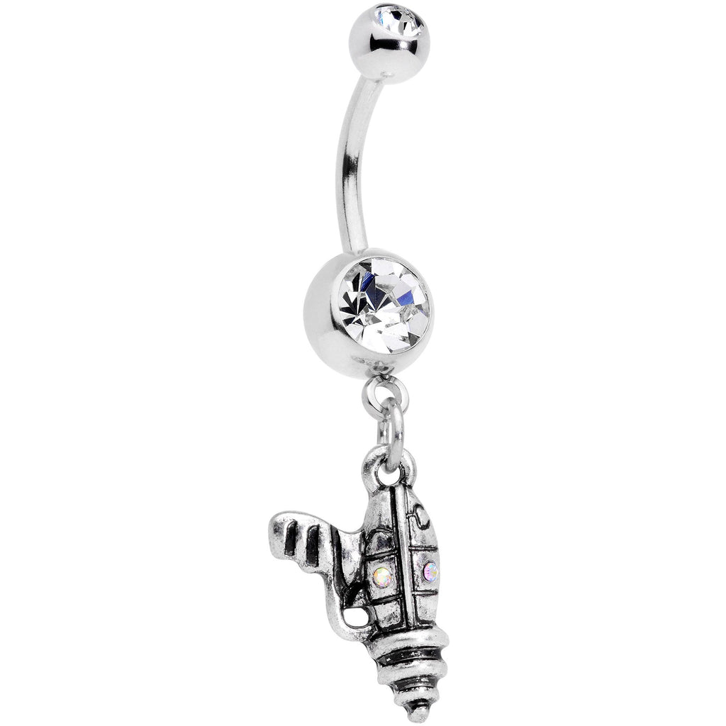 Is it a shrink ray? Is it a teleporter beam? This 14 gauge belly button ring will zap your look with a big dose of futuristic style! The 3/8" navel ring is made with a durable 316L surgical grade stainless steel curved barbell. It has a 5mm top ball end and an 8mm bottom ball end, both of which are set with clear gems. Dangling from the bottom is a mysterious, ultra-modern looking raygun. The body is embellished with tiny aurora gems that really catch the eye and keep it from being overwhelmed by the ball ends. This is a belly ring that is bound to leave your inner space traveler beaming with joy!