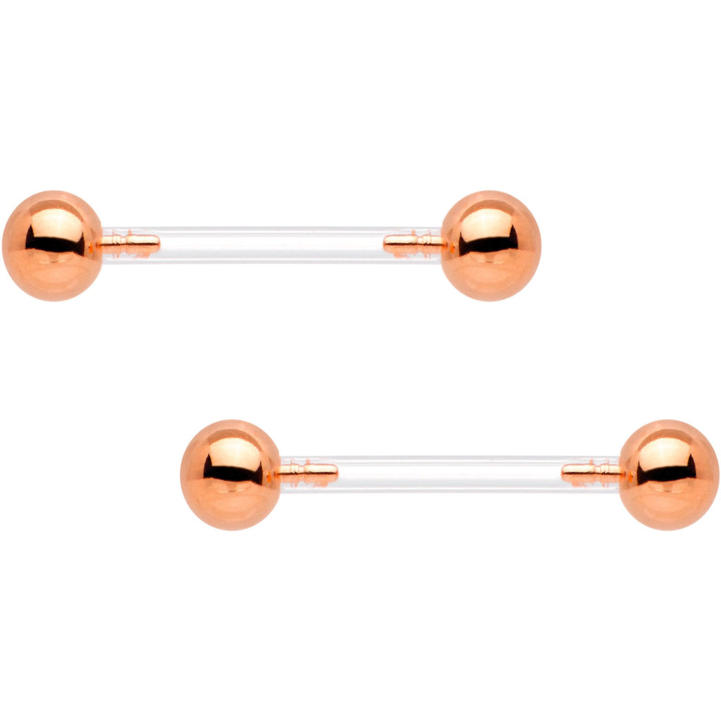 Whether you're looking for a more discrete look or you just want to up your piercing comfort level, you're all set with this pair of 14 gauge barbell nipple rings with eye-catching rose gold tone ball ends that will always have your nipple piercings looking on point! The 14mm length straight barbell used in this set of nipple jewelry is made from safe and flexible clear Bioplast and beautiful rose gold tone push in ends. Sold as a pair, this set of nipple rings is more than ready to make their way into your pierced nipples for a style that will bring low-maintenance glamour to any situation.