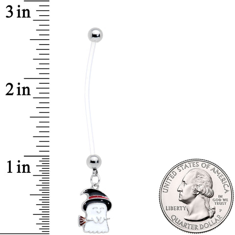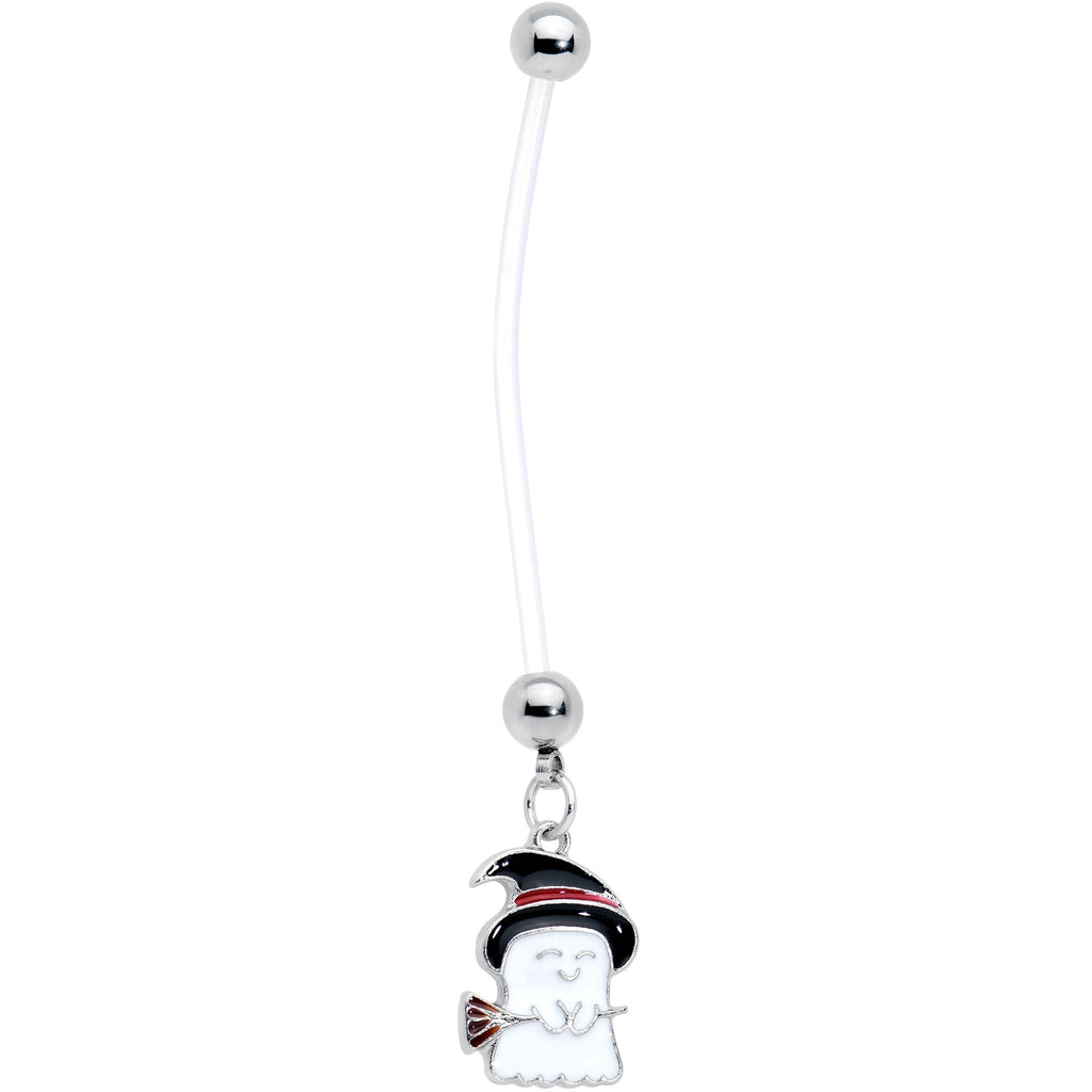 The ghost on this 14 gauge navel ring is sure to cast a spell on you! It's made with a 1 1/2" clear flexible Bioplast straight barbell with 5mm ball ends. Dangling from the bottom is a ghost charm, wearing a black witch's hat with a red band and carrying a broom. The flexible Bioflex barbell is self-threading and can be trimmed to a perfect fit. Simply cut where needed and reattach the ball end for a fit that's custom to your changing body. This witchy ghost is absolutely magic!Specifications