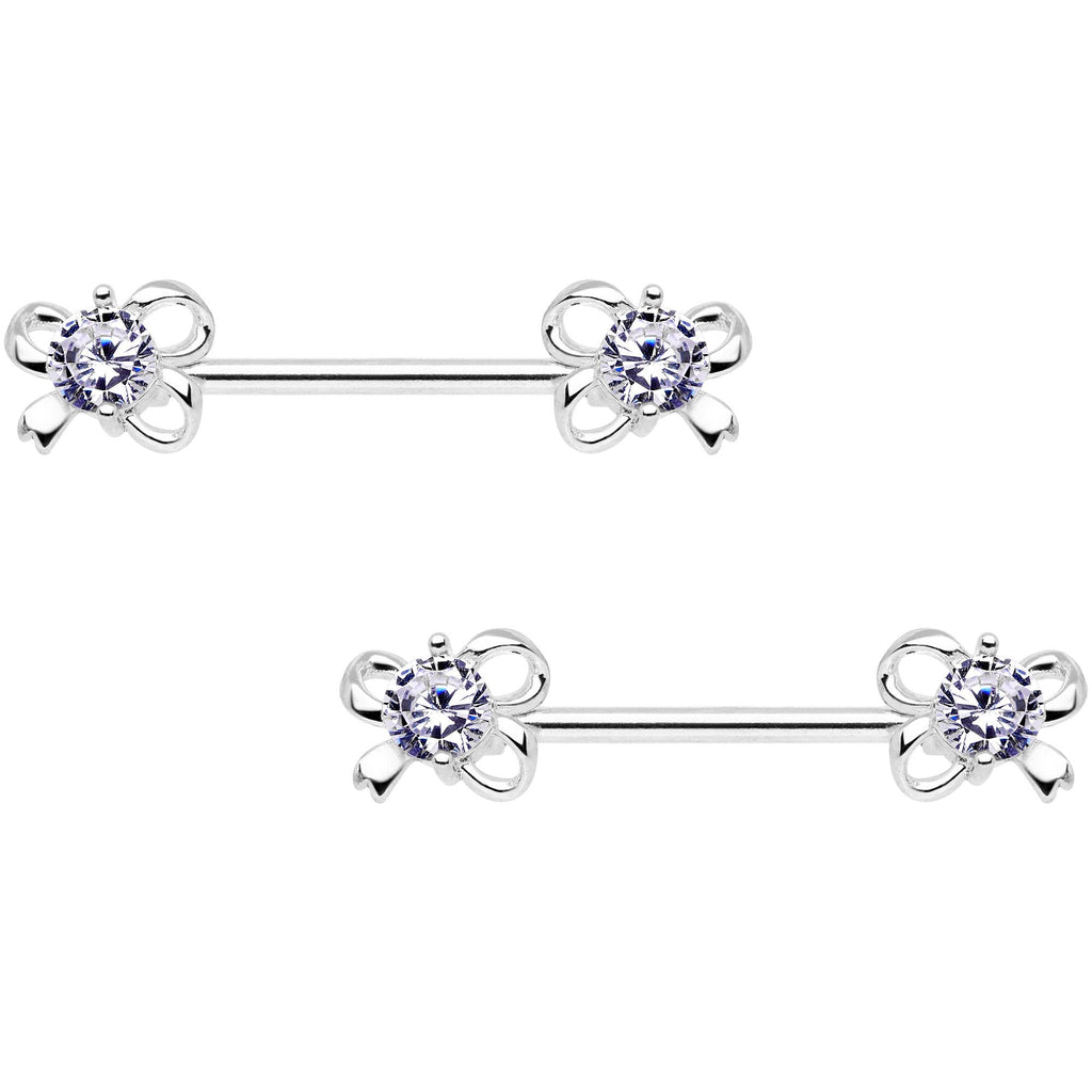 You'll feel all tied up in knots if you don't grab these fun nipple rings right now. These 14 gauge barbell nipple rings feature bows all tied in knots at each end, decorated by sparkling clear cubic zirconia gems. The bow tie ends are mounted on a pair of 5/8" in length durable 316L surgical grade stainless steel straight barbells. Sold as a pair of two for you!