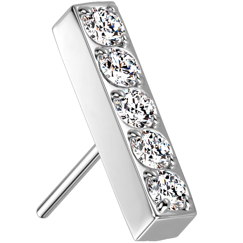 This threadless pin top will fit threadless push in post sizes between 14 gauge -20 gauge. It features a bar shaped charm, set with clear cubic zirconia gems.