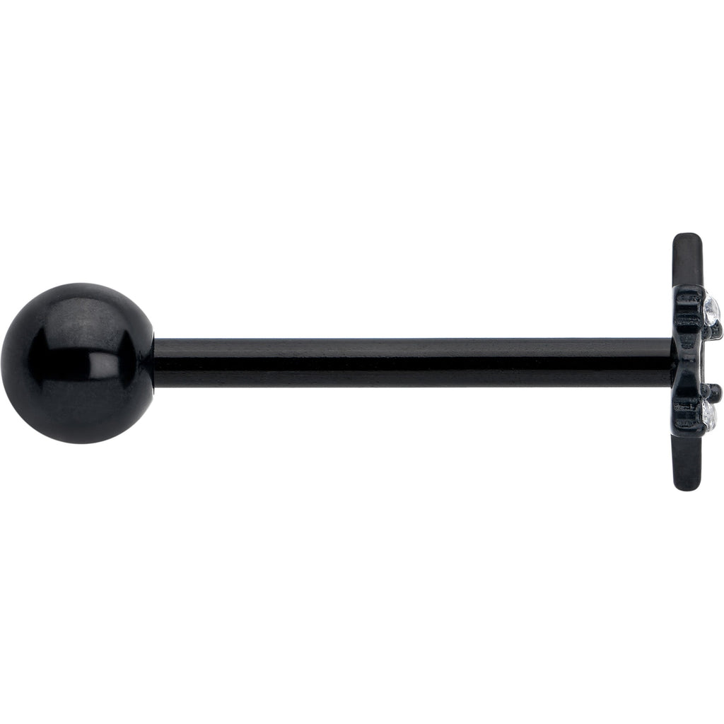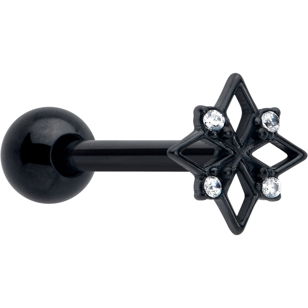 Fall in love with a goth new look, like on this 14 gauge tongue jewelry. It's made with a 5/8 inch black PVD over 316L surgical grade stainless steel straight barbell with a 6mm bottom ball end. The top features a star charm with an X over it, set with clear cubic zirconia gems at the cardinal points. It is further embellished with textured detailing for added style. Let your inner goth come out to play with this darkly divine tongue piercing ring.Specifications