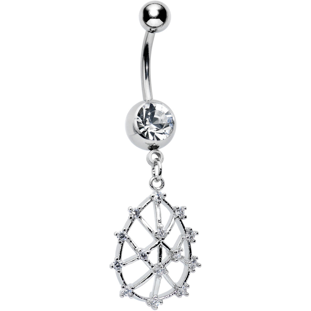 See a starry sky even during the day with this 14 gauge navel ring! It's made with a 3/8" durable 316L surgical grade stainless steel curved barbell with a 5mm top ball end. The bottom ball end is 8mm and set with a large clear gem, Dangling beneath it is a constellation charm, with all the stars represented by clear cubic zirconia gems. Make a star of your navel piercing with this astronomy-themed belly piercing jewelry!Specifications