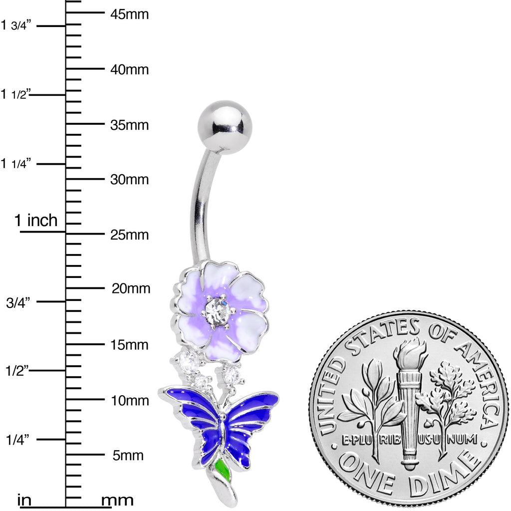 The butterfly on this 14 gauge navel ring has found a beautiful place to hang out! It's made with a 3/8" durable 316L surgical grade stainless steel curved barbell with a 5mm top ball end. The bottom end features a flower charm. The flower is white and purple, set at the center with a clear cubic zirconia gem. Below it are several more clear cubic zirconia gems, with a blue-inlaid butterfly below it. It's finished with a green leaf embellishment for a truly cohesive appearance. Let your look blossom with this beautiful butterfly belly button jewelry!Specifications