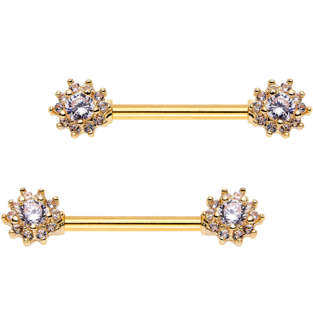 Looking to add a little bit of the beauty of flowering fields to your nipple piercings? Well, this pair of 14 gauge barbell nipple rings will be exactly what you need to gain the floral look you've always desired. The 14mm length straight barbell used for this set of nipple jewelry is made from gold plated over 316L surgical grade stainless steel and includes clear cubic zirconia gem clusters that form flower-inspired ends. Sold as a set of two for you!