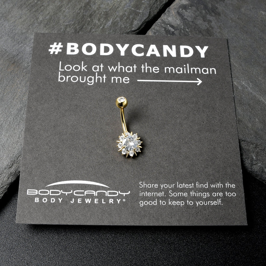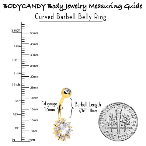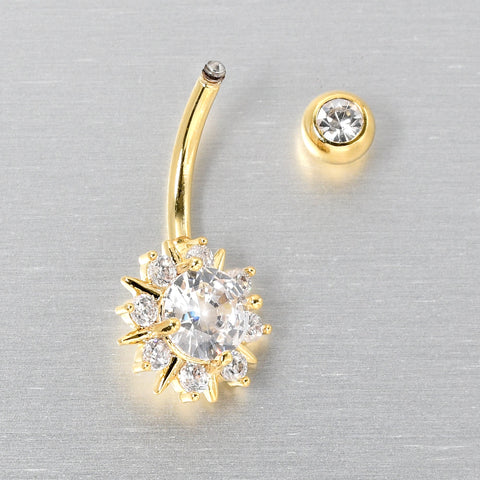 Let the sun shine and take your look uptown with this 14 gauge navel ring It is made with a 10mm gold tone plated over 316L surgical grade stainless steel curved barbell. The top ball end is 5mm and set with a clear cubic zirconia gem. The bottom end features a sun charm, with a large clear cubic zirconia gem center and smaller clear cubic zirconia gems set among the suns rays. You will be looking sumptuous and sunny with this stylish, solar-themed belly piercing ring.