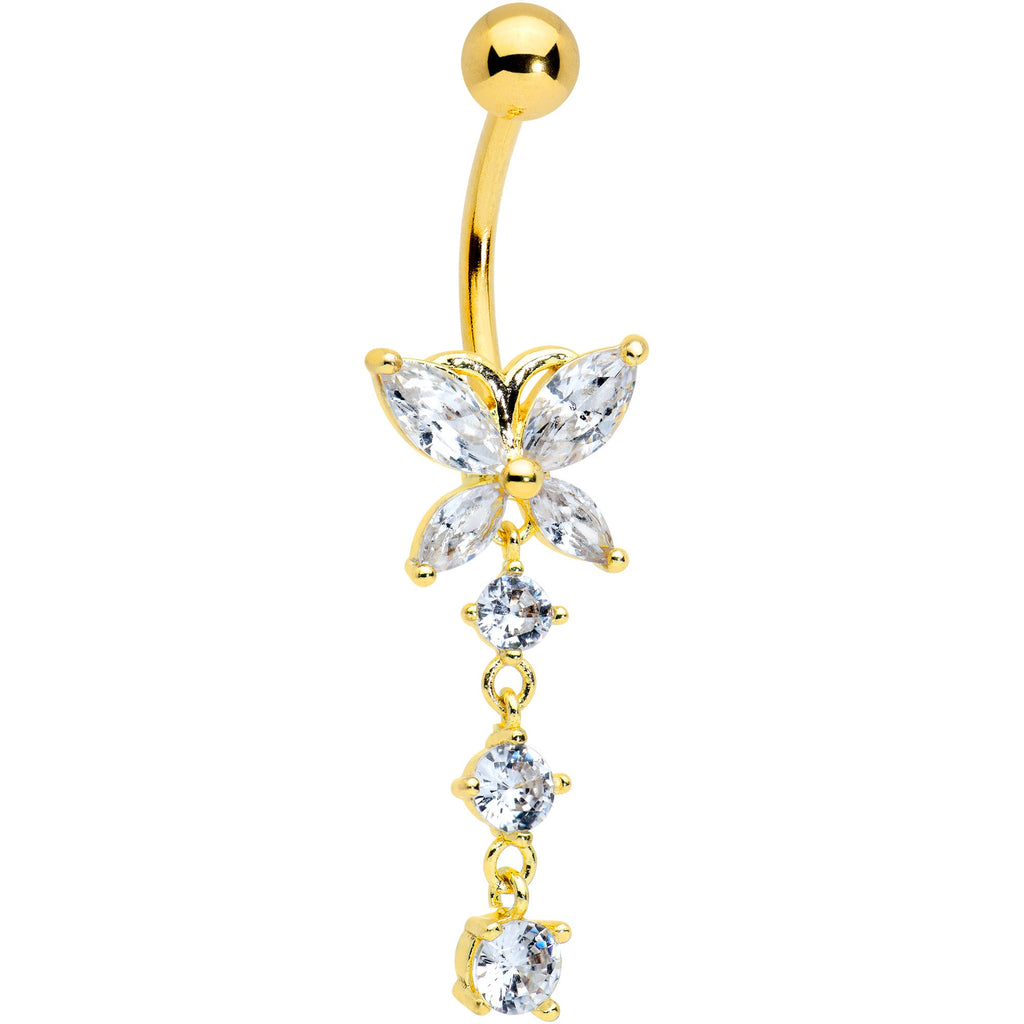 Keep your look open to new styles like the butterfly on this 14 gauge navel ring! It's made with a 7/16" gold tone plated over 316L surgical grade stainless steel curved barbell with a 5mm top ball end. The bottom end features a butterfly charm, with the top portion of the wings set with clear cubic zirconia gems. The bottom portion of the wings are matching clear cubic zirconia gems for a luxe appearance. Dangling beneath the butterfly is a length of chain, holding three matching clearcubic zirconia gems for a cohesive and stylish appearance. Let this belly button jewelry remind you that if you keep yourself open, you can fly!Specifications