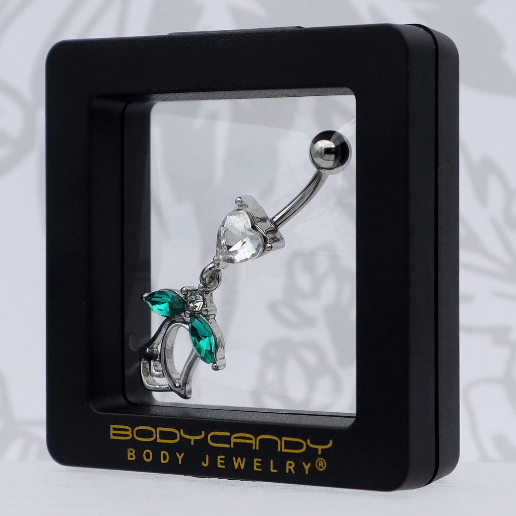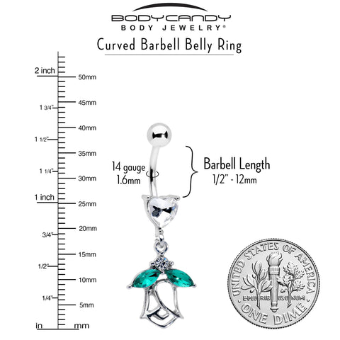 What could be more romantic than this 14 gauge navel jewelry? It is made with a 3/8 inch 316L surgical grade stainless curved barbell with a 5mm top ball end. The bottom features a clear cubic zirconia gem in the shape of a heart. Dangling beneath the heart is a rose charm, with the leaves composed of green cubic zirconia gems and an airy, openwork design. Fall in love with this richly romantic belly piercing ring.Specifications