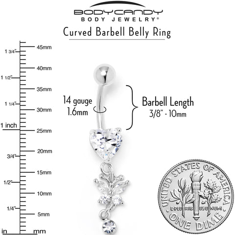 Show some love for butterflies with this 14 gauge navel ring. It is made with a 3/8 inch 316L surgical grade stainless steel curved barbell with a 5mm top ball end. The bottom end is composed of a clear cubic zirconia heart charm. Dangling beneath it is a butterfly charm, composed of clear cubic zirconia gems with another clear cubic zirconia gem dangle beneath for a cohesive and luxe appearance. Fall in love with beauty with this butterfly belly piercing ring.