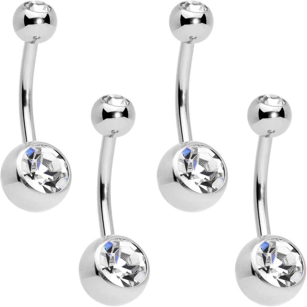 This set of 14 gauge navel rings has you covered if you tend to misplace your jewelry! These navel rings are made with 7/16" durable 316L surgical grade stainless steel curved barbells. Each one has a 5mm top ball end and an 8mm bottom ball end, all set with clear cubic zirconia gems. They're also internally threaded to make insertion and removal super comfortable in newer and healed piercings. You'll never be without jewelry for your belly piercing again with this set of elegantly simple, classic navel jewelry! Sold as a set of four.Specifications