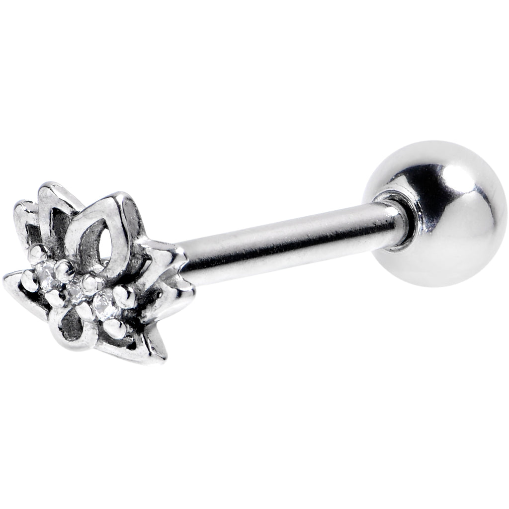 Clear CZ Gem Lush Lotus Flower Barbell Tongue Ring
