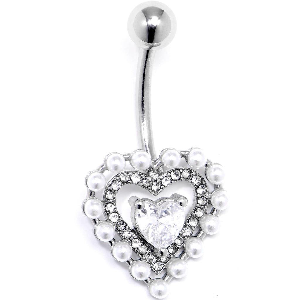 Get double the love with this 14 gauge navel ring. It is made with a 3/8 inch 316L surgical grade stainless steel curved barbell with a 5mm top ball end. It features a heart charm, composed of a single clear cubic zirconia gem heart center, surrounded by a second heart of faux pearl embellishments to create two hearts in one. You will totally fall in love with this belly piercing jewelry.Specifications