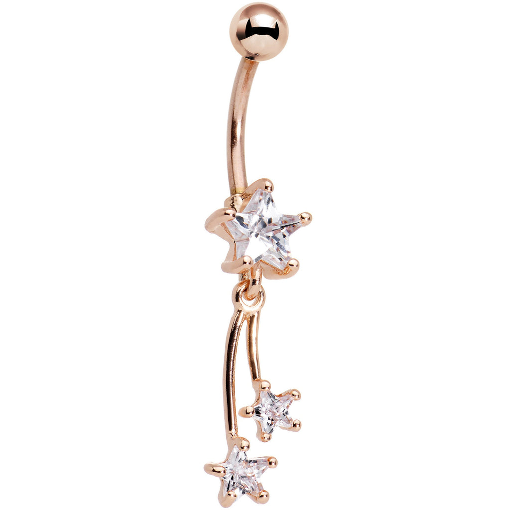 Catching sight of a comet can be rare, but you can catch one with this fun 14 gauge shooting star navel piercing! A clear star-shaped cubic zirconia gem sits at the base of a 7/16" curved barbell made with rose gold anodized over durable 316L surgical grade stainless steel. Dangling from the bottom of the clear star gem are two smaller clear star gems that shoot off like a comet's tail.