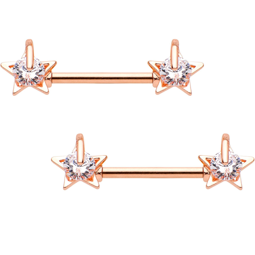 This fun set of nipple BCR captive rings and straight barbell nipple rings gives you a lot of options. Wear the matching set of captive rings, the matching set of barbells, or mix them up! The 14 gauge captive nipple rings are 9/16" in length are made with rose gold PVD over 316L surgical grade stainless steel. The 9/16" straight barbells are also 14 gauge, feature clear cubic zirconia front facing gems mounted on star-shaped metalwork designs, and are made with rose gold PVD over 316L surgical grade stainless steel. Sold as a set of four.
